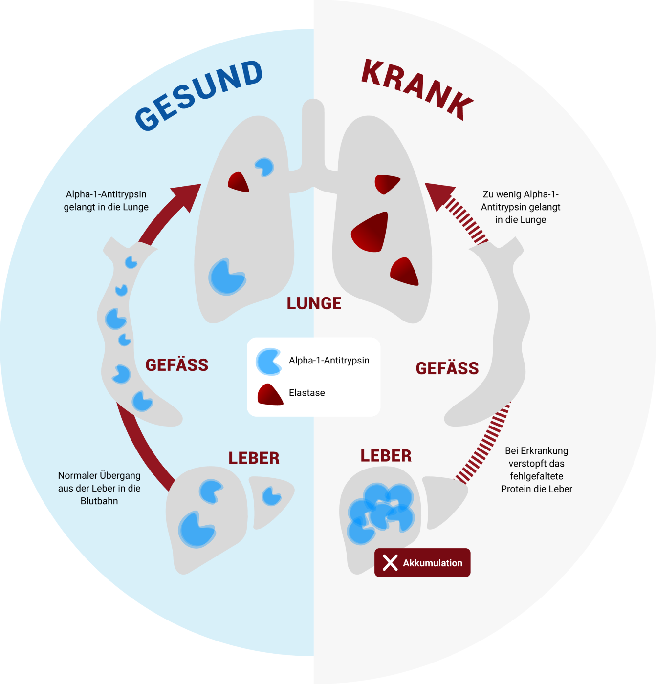 Bei gesunden Menschen wird das Protein Alpha-1-Antitrypsin in der Leber gebildet und gelangt von dort ins Blut. Wenn ein Alpha-1-Antitrypsin-Gendefekt vorliegt, bildet die Leber ein fehlerhaftes Alpha-1-Antitrypsin.